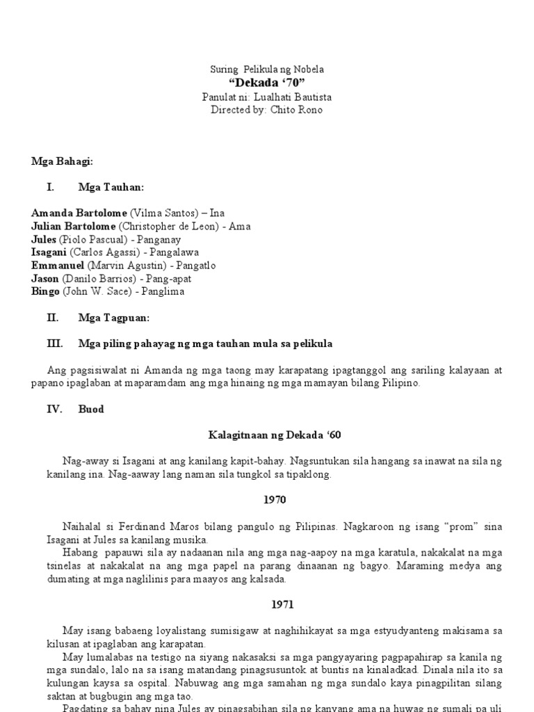 Ang ikaapat Danilo Barrios ay naging biktima ng isang tiwaling kagawaran ng pulisya habang isa pa lamang paslit na bunsong lalaki John W. Dekada 70 Buod Kuwento ito ng isang tipikal na inang si Amanda Bartolome na nabago ng magulo at mapangahas na mundong pinasok ng kaniyang mga anak. The 70s is a Filipino novel by Lualhati BautistaIt tells the story of a middle-class family in Manila living through martial law under Ferdinand MarcosThe novel was awarded the.